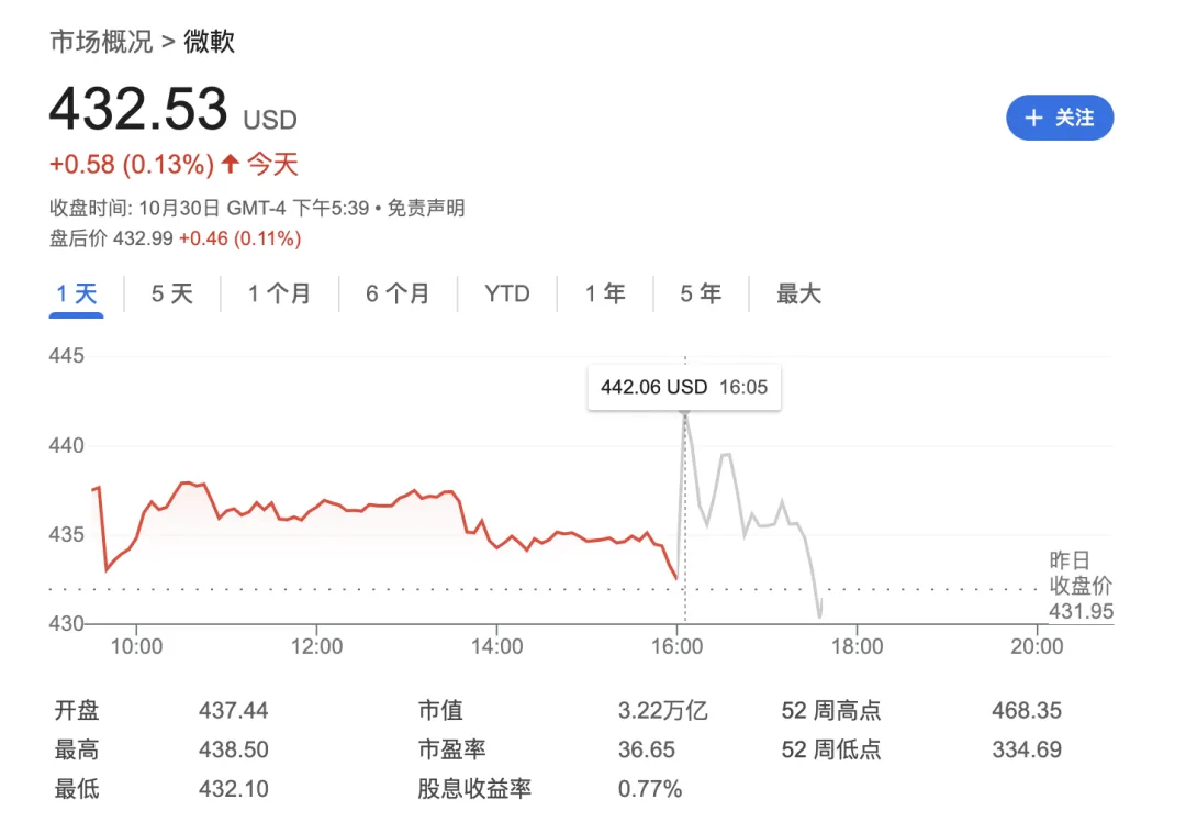 盘后,微软的股价一度达到442美元,随后转跌,落到415美元(截止写稿时):