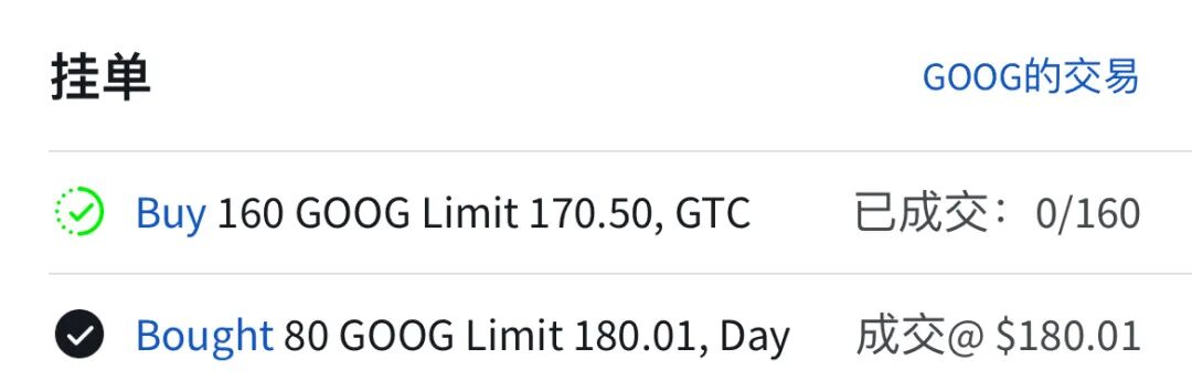 谷歌下跌2.11%,收盘价177.37美元,两个新账户设置的180买入被触发,顺利买入,并设置了新的买入节点: