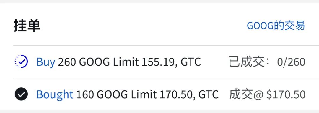 谷歌下跌2.57%,收盘价170.21,我两个新账户设置的170买入,顺利触发,并设置了新的防守价位节点: