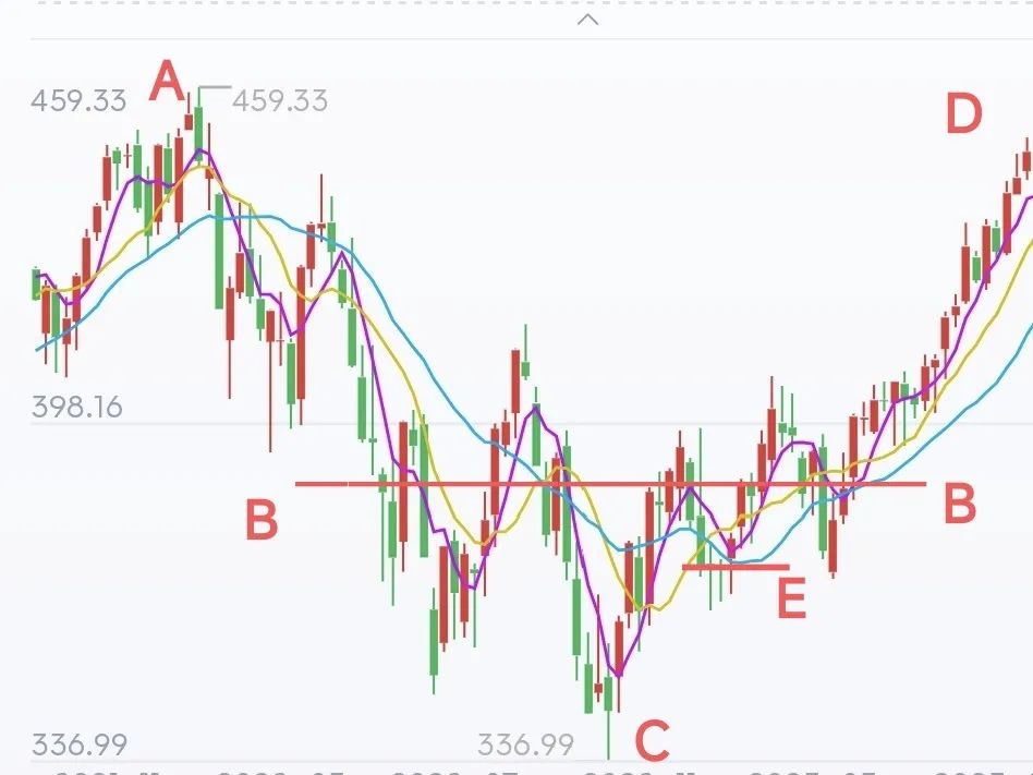 从A点一直投到C点,成本大概会在B点,B到D点就是赚取的账面浮盈;从A点一直投到E点,成本大概会在BE之间,等上涨到D点,账面浮盈会比BD更高一些。