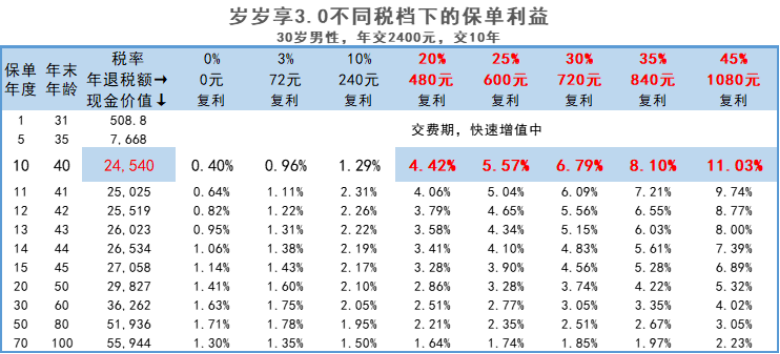 以目前更好的岁岁享3.0为例,每年投2400元、交10年,这10年都能抵税,还能根据税率区间的不同享受到10年期较高的一个利率(20%税率持有10年4.42%复利),税率越高收益越高,封顶可以达到11%复利。